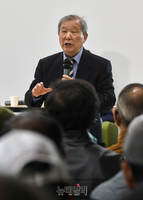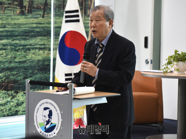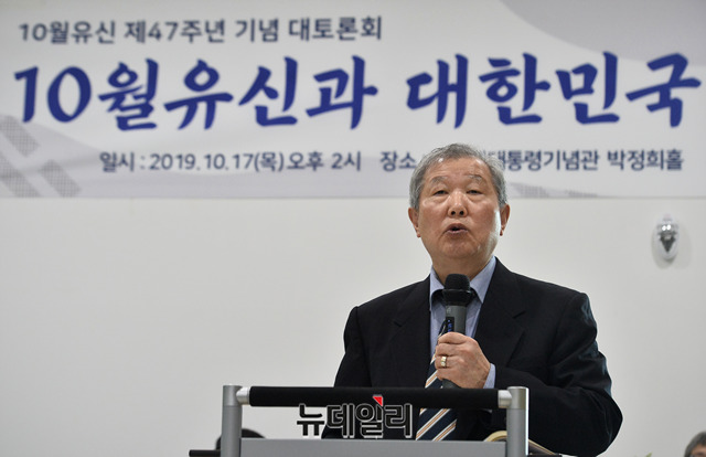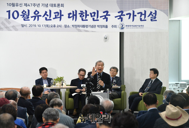 김세중 전 연세대 교수가 17일 오후 서울 마포구 박정희대통령기념관에서 열린 '10월 유신 제47주년 기념 대토론회(10월 유신과 대한민국 국가건설)'에서 '10월유신을 위한 변명-유신 강한권위주의 처제의 순기능을 중심으로'라는 주제로 발제하고 있다.