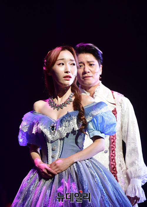 배우 임태경, 김금나가 17일 오후 서울 서초구 한전아트센터에서 열린 뮤지컬 '드라큘라' 프레스콜에서 하이라이트 장면을 시연하고 있다. 13년 만에 국내 무대 귀환한 뮤지컬 '드라큘라'는 12월 1일까지 한전아트센터에서 공연된다.