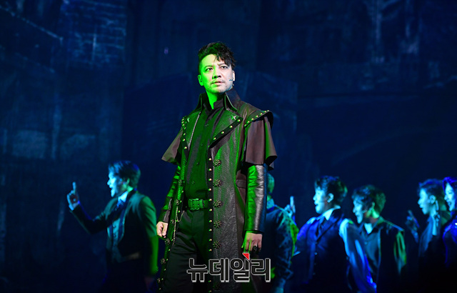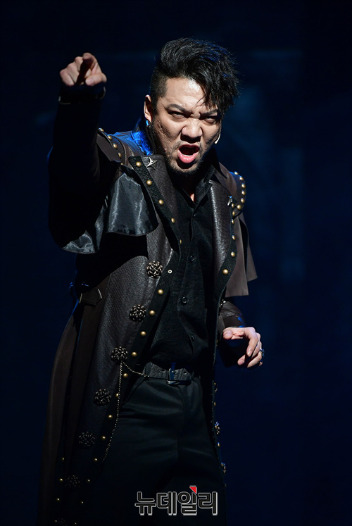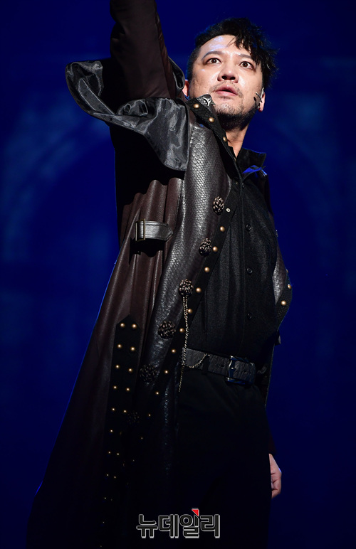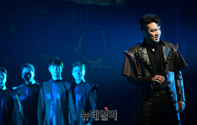 배우 문종원이 17일 오후 서울 서초구 한전아트센터에서 열린 뮤지컬 '드라큘라' 프레스콜에서 하이라이트 장면을 시연하고 있다. 13년 만에 국내 무대 귀환한 뮤지컬 '드라큘라'는 12월 1일까지 한전아트센터에서 공연된다.