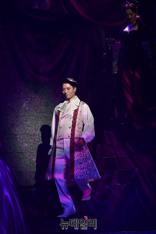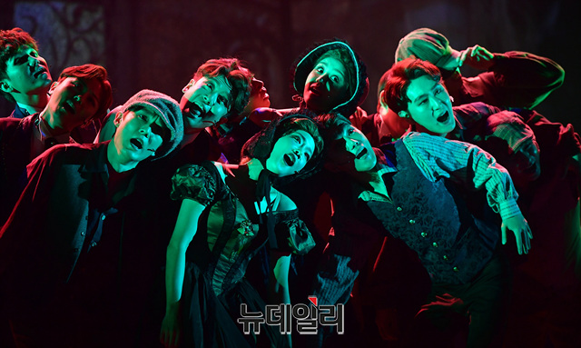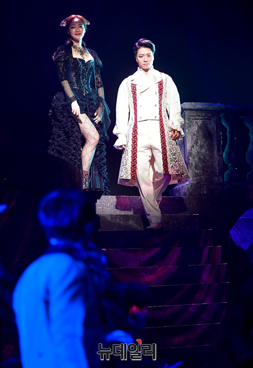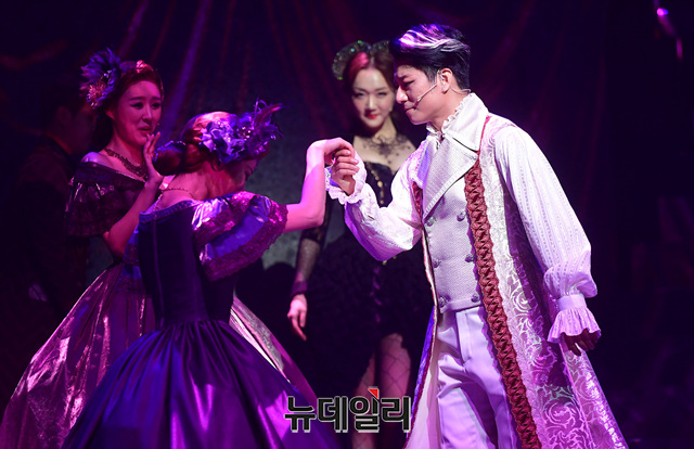 배우 임태경, 황한나가 17일 오후 서울 서초구 한전아트센터에서 열린 뮤지컬 '드라큘라' 프레스콜에서 하이라이트 장면을 시연하고 있다. 13년 만에 국내 무대 귀환한 뮤지컬 '드라큘라'는 12월 1일까지 한전아트센터에서 공연된다.