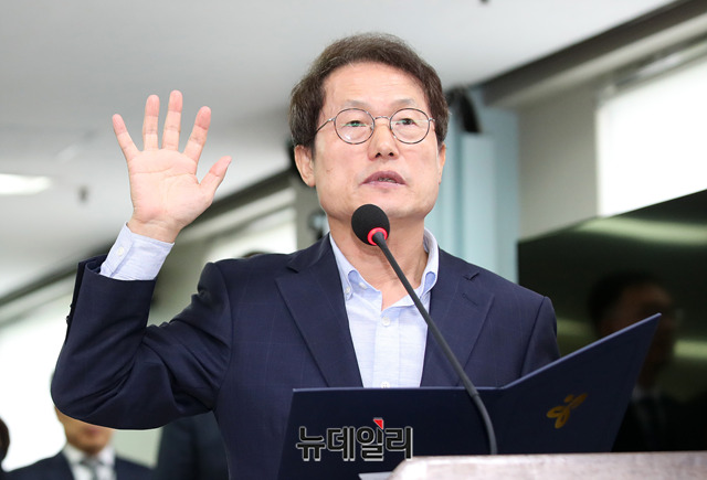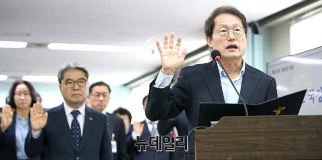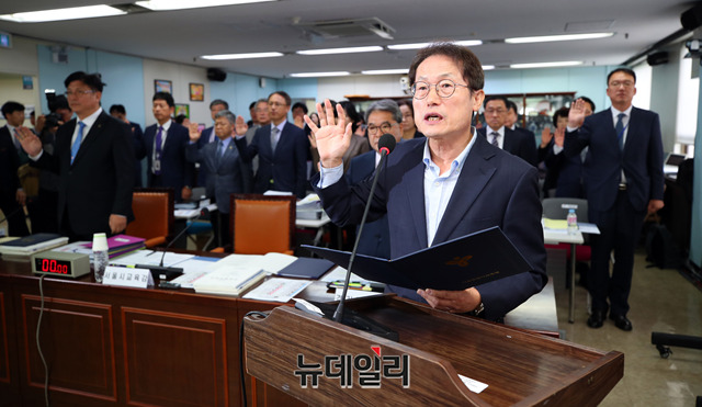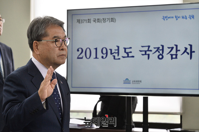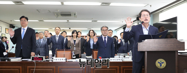 조희연 서울시 교육감과 이재정 경기도 교육감이 18일 오전 서울 종로구 서울시교육청에서 열린 국회 교육위원회 국정감사에서 증인선서를 하고 있다.