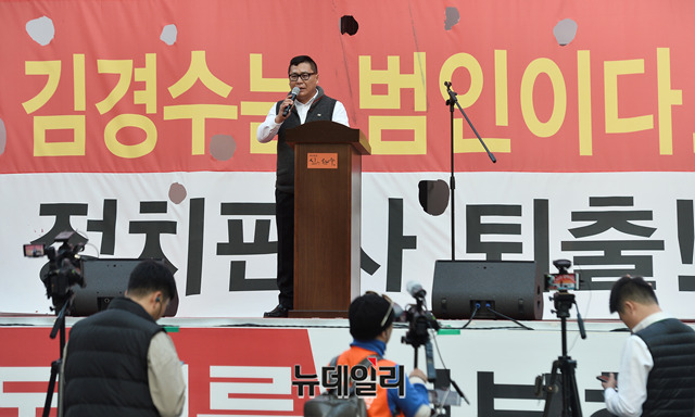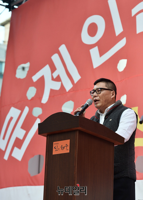 황경구 애국순찰팀 단장이 18일 오후 서울 서초구 교대역앞에서 열린 '좌파 정치 판사 규탄 결의 대회'에서 발언을 하고 있다.