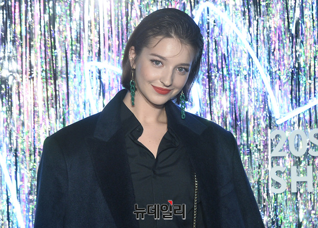 모델 안젤리나 다닐로바가 18일 오후 서울 용산구 서울드래곤시티 스카이킹덤에서 열린 '20SS 메트로시티 패션쇼 파티'에서 포토타임을 갖고 있다.