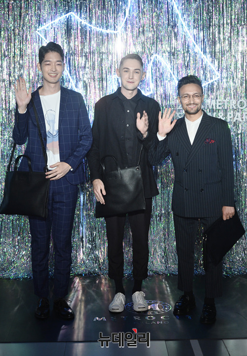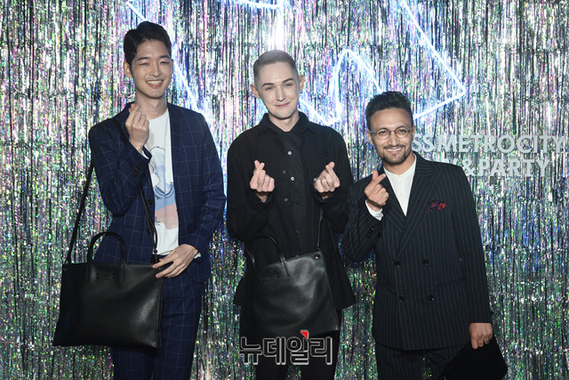 방송인 오오기(왼쪽부터), 블레어, 자히드가 18일 오후 서울 용산구 서울드래곤시티 스카이킹덤에서 열린 '20SS 메트로시티 패션쇼 파티'에서 포토타임을 갖고 있다.