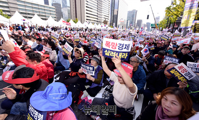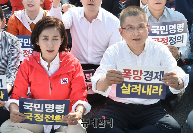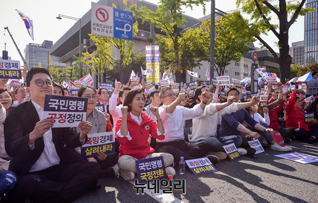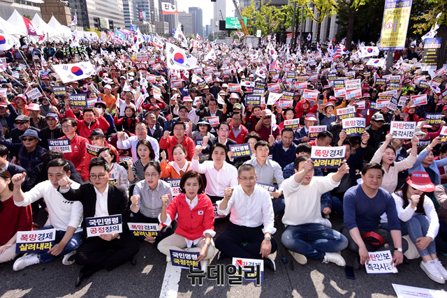 황교안 자유한국당 대표와 나경원 원내대표, 한국당 의원 및 참석자들이 19일 오후 서울 광화문 광장에서 열린 '국민의 명령! 국정 대전환 촉구 국민 보고대회'에서 구호를 외치고 있다.