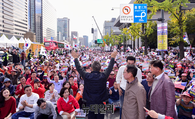 황교안 자유한국당 대표가 19일 오후 서울 광화문 광장에서 열린 한국당 보고대회에서 시민들에 환호에 답하고 있다.
