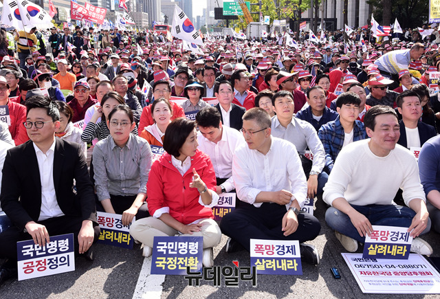 황교안 자유한국당 대표와 나경원 원내대표가 19일 오후 서울 광화문 광장에서 열린 '국정 대전환 촉구 국민 보고대회'에서 대화를 나누고 있다.