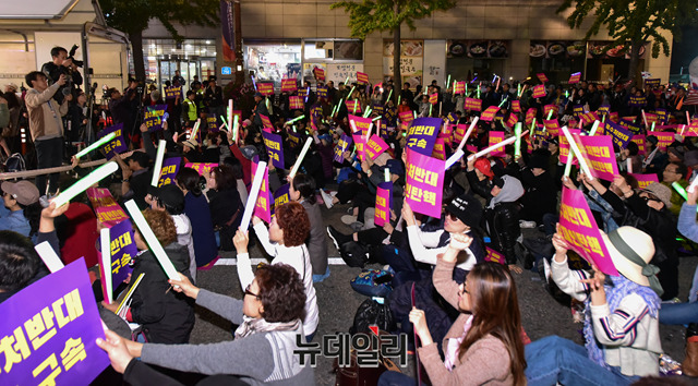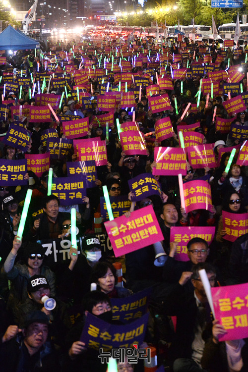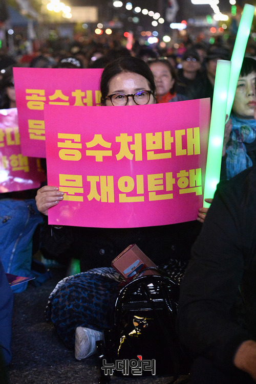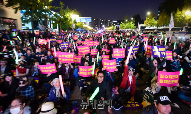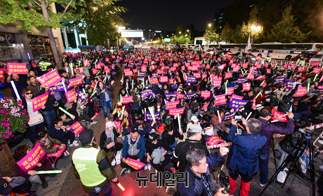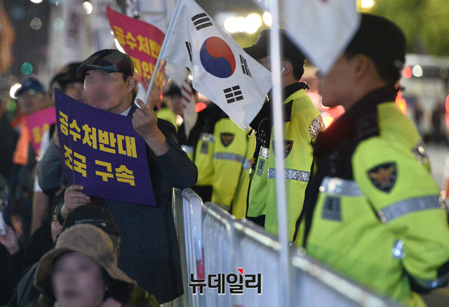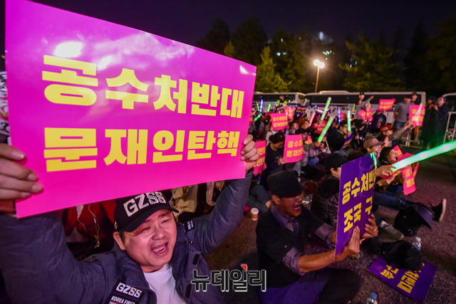 우파단체 자유연대와 GZSS가 19일 오후 서울 여의도 국회 앞에서 열린 '공수처 반대, 조국 구속 촉구' 집회에서 손 피켓을 들고 구호를 외치고 있다. 이들은 국회 앞에서 좌파단체가 연 '검찰개혁 촉구집회'를 저지하기 위해 일정을 변경해 집회를 개최했다.