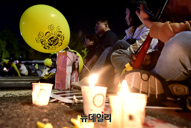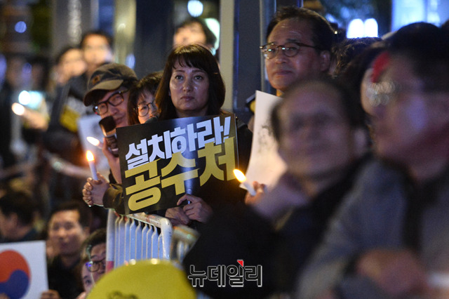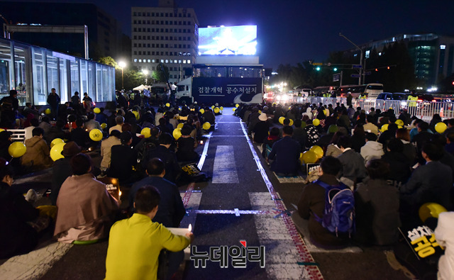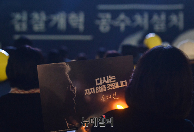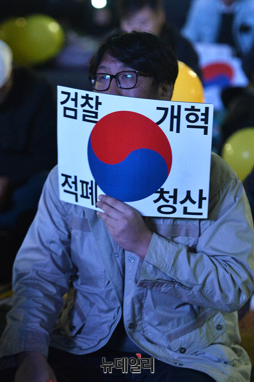검찰개혁사법적폐청산 범국민시민연대가 19일 오후 서울 여의도 국회 앞에서 열린 '우리가 조국이다' 촛불집회에서 손 피켓을 들고 있다.