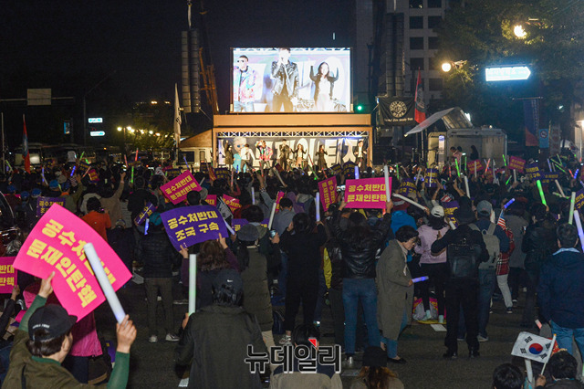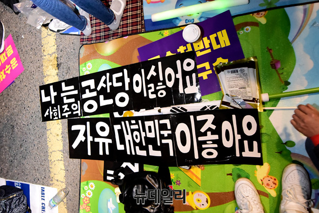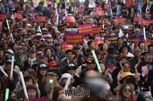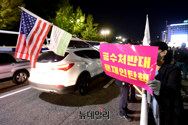 우파단체 자유연대와 GZSS가 19일 오후 서울 여의도 국회 앞에서 열린 '공수처 반대, 조국 구속 촉구' 집회에서 구호를 외치고 있다. 이들은 국회 앞에서 좌파단체가 연 '검찰개혁 촉구집회'를 저지하기 위해 일정을 변경해 이날 집회를 개최했다.