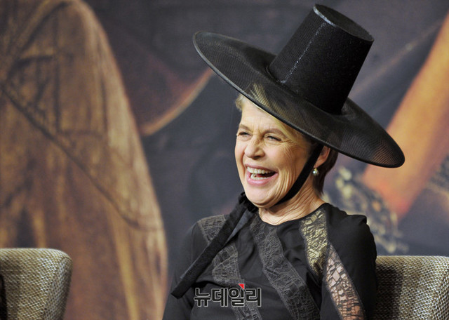 린다 해밀턴이 21일 오전 서울 종로구 포시즌스호텔 서울에서 열린 영화 '터미네이터: 다크 페이트' 내한 기자회견에서 선물 받은 갓을 쓰고 있다.