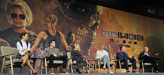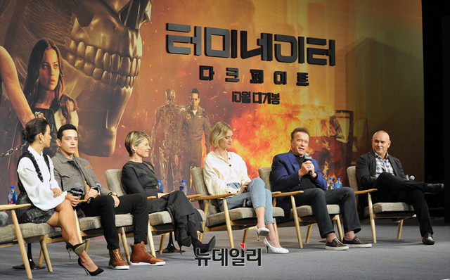 나탈리아 레이즈, 가브리엘 루나, 린다 해밀턴, 맥켄지 데이비스, 아놀드 슈왈제네거, 팀 밀러 감독(왼쪽부터)이 21일 오전 서울 종로구 포시즌스호텔 서울에서 열린 영화 '터미네이터: 다크 페이트' 내한 기자회견에서 취재진의 질문을 받고 있다.