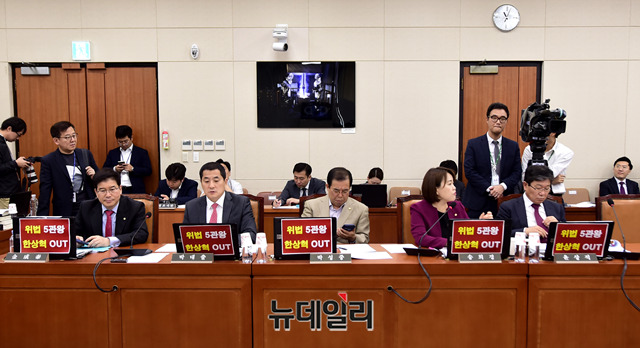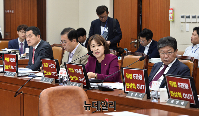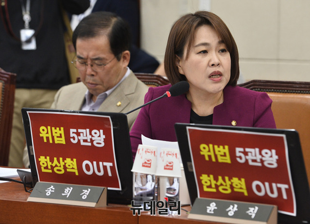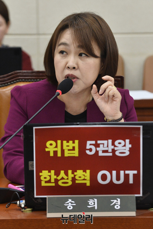 송희경 자유한국당 의원이 21일 오전 국회에서 열린 과학기술정보방송통신위원회 국정감사에 참석해 질의를 하고 있다. 이날 자유한국당 과학기술정보방송통신위원회 위원들은 책상 노트북에 '위법 5관왕, 한상혁 OUT' 문구가 적힌 글을 붙이고 감사를 진행했다.