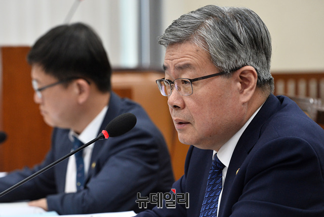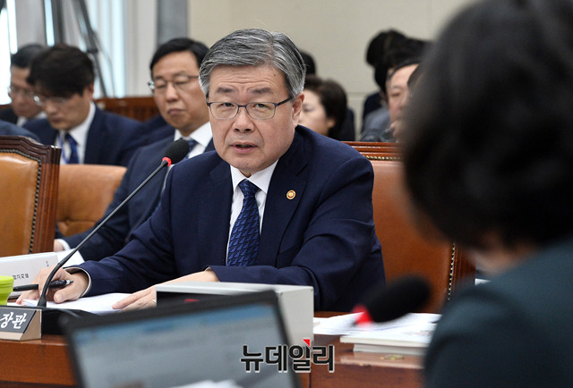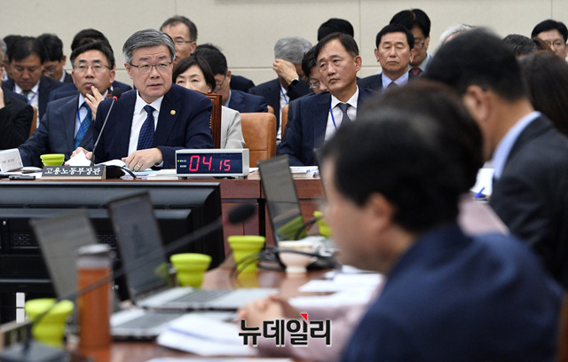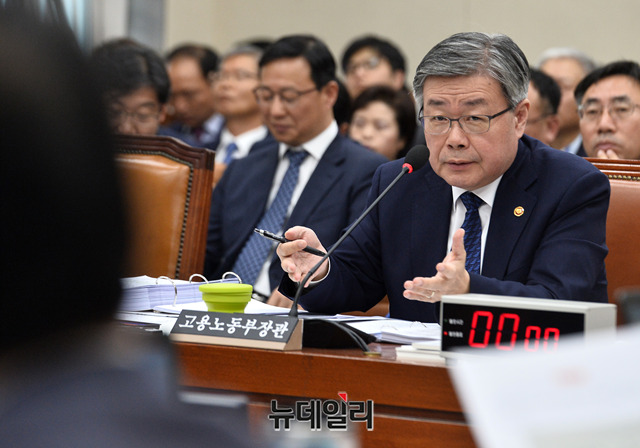 이재갑 고용노동부 장관이 21일 오전 국회에서 열린 환경노동위원회 국정감사에서 의원들의 질의에 답하고 있다.