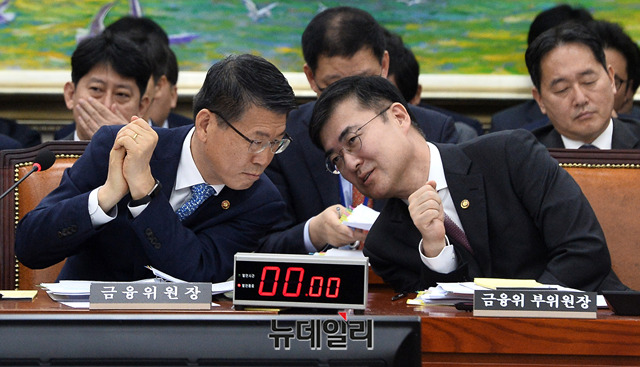 은성수 금융위원장과 손병두 부위원장이 21일 오전 국회에서 열린 정무위원회 국정감사에서 대화를 하고 있다.