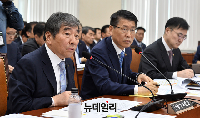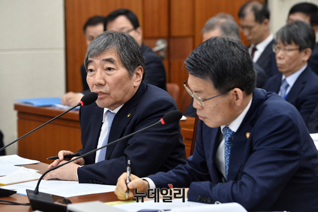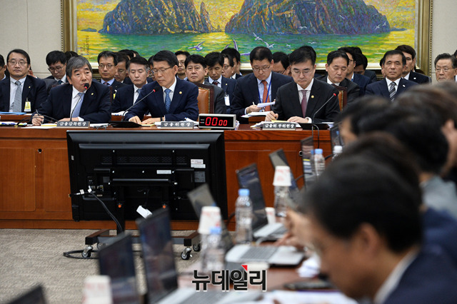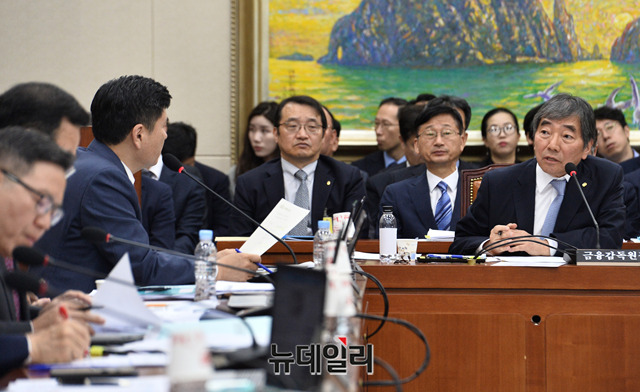 윤석헌 금융감독원장이 21일 오전 국회에서 열린 정무위원회 국정감사에서 의원들의 질의에 답하고 있다.