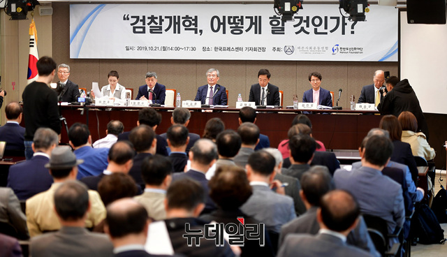 바른사회운동연합과 한반도선진화재단이 공동으로 주최한 '검찰개혁, 어떻게 할 것인가?' 토론회가 21일 오후 서울 중구 한국프레스센터에서 진행되고 있다. 이날 토론회는 이승훈 서울대 명예교수의 사회로 장영수 고려대 교수가 발제를 맡았다. 이어진 토론에는 금태섭 의원, 이언주 의원, 이승구 변호사, 김종민 변호사, 김진오 CBS논설위원이 참석했다.
