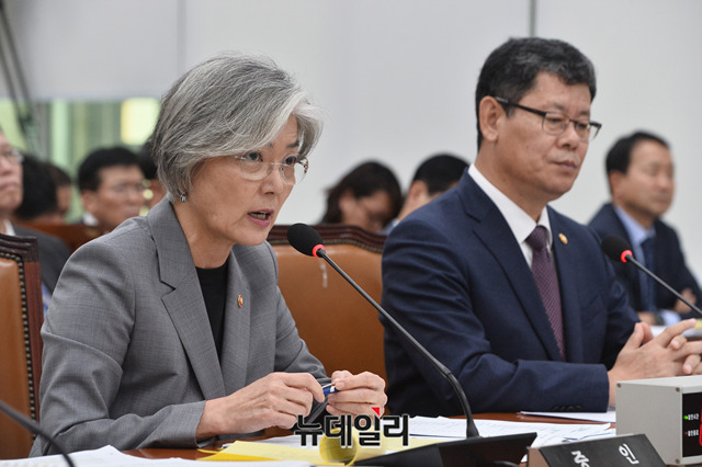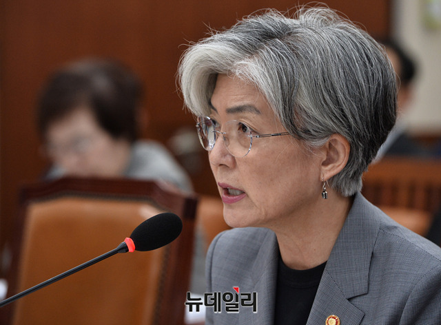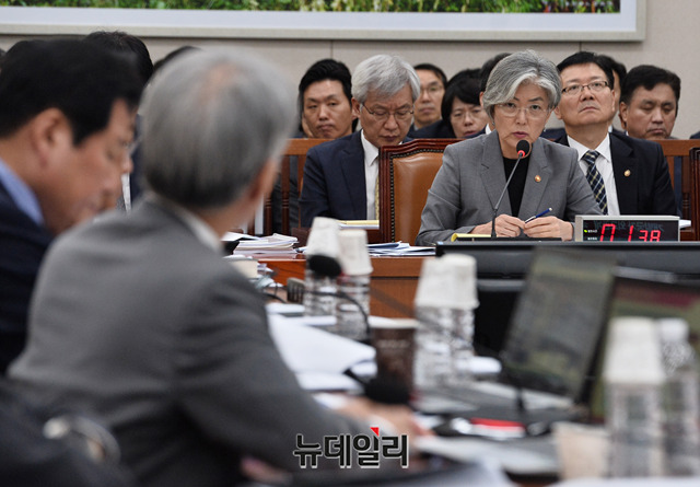 강경화 외교부 장관이 21일 오후 국회에서 열린 외교통일위원회 종합 국정감사에서 한일정상회담 관련 질의에 답하고 있다.