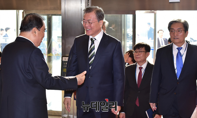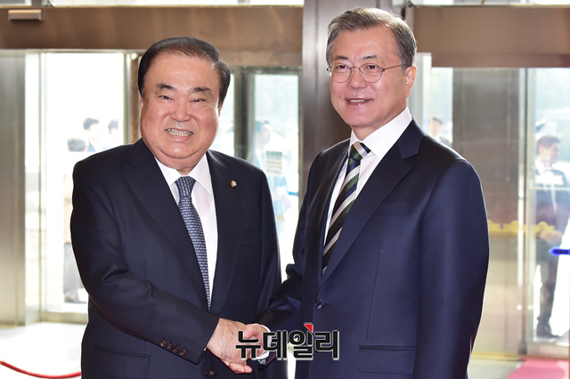 문재인 대통령이 22일 오전 국회 본회의장에서 열린 2020년도 예산안 시정연설에 참석하기에 앞서 문희상 국회의장과 악수를 나누고 있다. (사진=공동취재단)