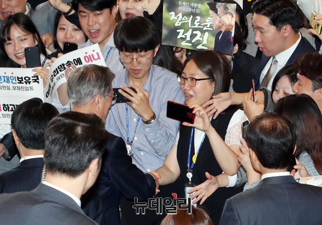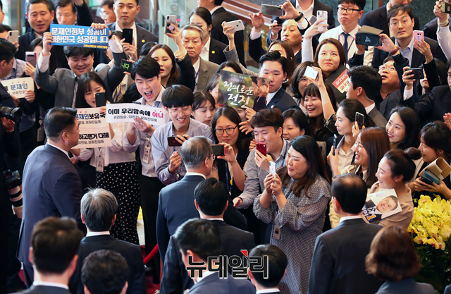 [포토] 민주당 당직자들 환영받는 문재인 대통령