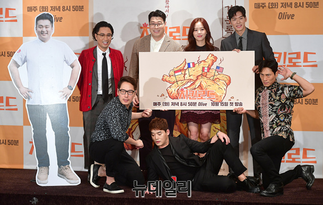 치킨로드 출연진들이 22이 오후 서울 여의도 켄싱턴호텔에서 열린 기자간담회에서 포토타임을 갖고 있다. '치킨로드'는 한국인의 소울푸드 '치킨'의 새 레시피를 개발하기 위해 셰프들과 함께 떠나는 예능 프로그램이다. 매주 화요일 저녁 8시 50분에 방송.