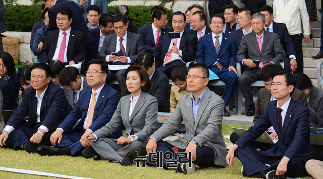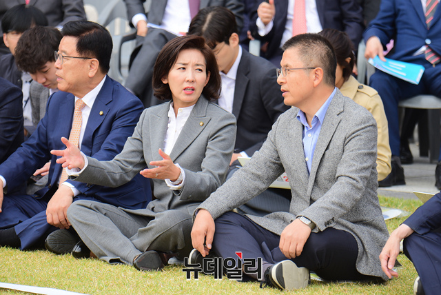 황교안 자유한국당 대표와 나경원 원내대표가 24일 오전 국회 본청 앞에서 '자유와 평화의 G5를 향하여'를 민평론 외교안보 정책비전을 발표에 앞서 대화를 나누고 있다.