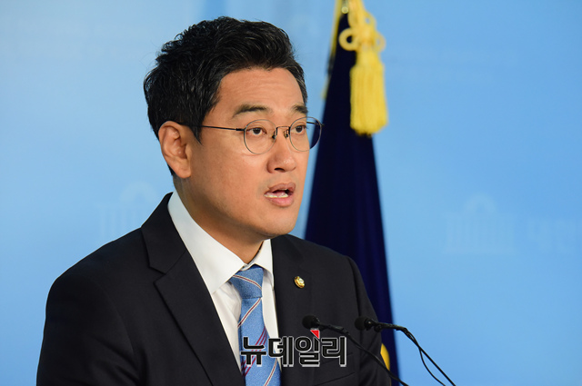 오신환 바른미래당 원내대표가 24일 오전 국회 정론관에서 손학규 당대표의 당비 대납 의혹 제보 및 선관위 고발에 따른 조사 촉구 기자회견을 하고 있다.