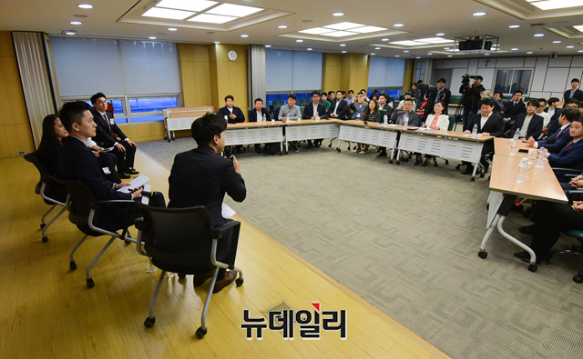 황교안 자유한국당 대표가 25일 오전 국회 의원회관에서 열린 '청년창업 소상공인 토크콘서트'에 참석해 행사를 지켜보고 있다.