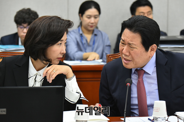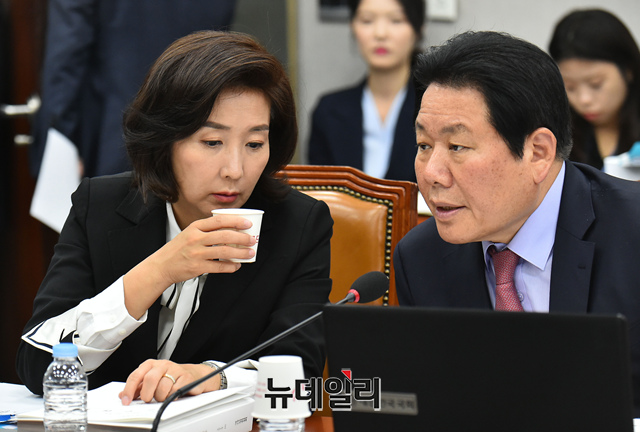 나경원 자유한국당 원내대표와 정양석 원내수석부대표가 25일 오전 국회에서 열린 운영위원회 국정감사에 참석해 대화를 나누고 있다.