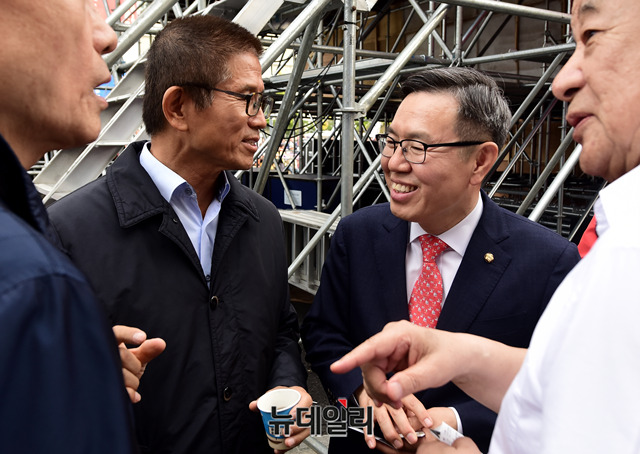김문수 전 경기지사와 정태옥 자유한국당 의원이 25일 오후 서울 광화문광장에서 열린 조국 전 법무부 장관 구속과 문재인 하야를 촉구하는 '제3차 범국민 투쟁대회'에서 대화를 하고 있다.'제3차 범국민 투쟁대회'는 광화문 광장에서 오후 3시부터 사전행사를 진행했다. 이어 오후 7시부터 본집회를 갖고 오후 10시부터 철야기도를 이어갈 예정이다.이날 열린 대회에는 문재인하야범국민투쟁본부, 한기총·한교연·한교총, 불교 대불총, 천주교 대수천 등 우파단체 및 시민들이 대거 참석했다.