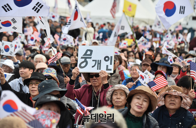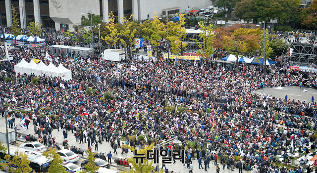 조국 전 법무부 장관 구속과 문재인 하야를 촉구하는 '제3차 범국민 투쟁대회'에 참석한 시민들이 25일 오후 서울 광화문광장에서 태극기와 성조기를 흔들며 구호를 외치고 있다.'제3차 범국민 투쟁대회'는 광화문 광장에서 오후 3시부터 사전행사를 진행했다. 이어 오후 7시부터 본집회를 갖고 오후 10시부터 철야기도를 이어갈 예정이다.이날 열린 대회에는 문재인하야범국민투쟁본부, 한기총·한교연·한교총, 불교 대불총, 천주교 대수천 등 우파단체 및 시민들이 대거 참석했다.