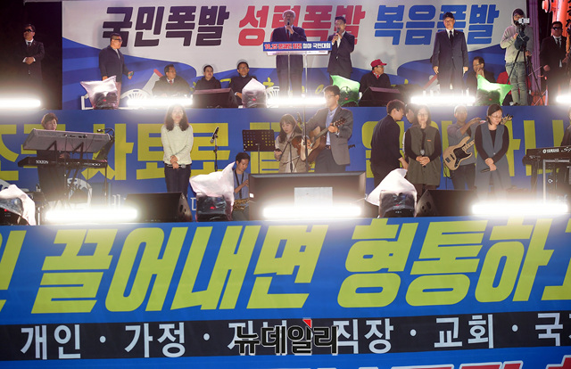 전광훈 한기총 대표회장이 25일 오후 광화문 광장에서 열린 문재인 퇴진 촉구 집회에서 발언하고 있다. 이번 국민대회는 지난 3일 개천절과 9일 한글날에 이은 3번째다. 15시 리허설을 시작으로 19시부터 투쟁대회를 거쳐 22시부터 다음날 오전까지 밤샘 철야기도가 이어진다.