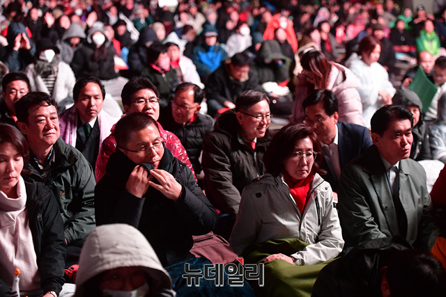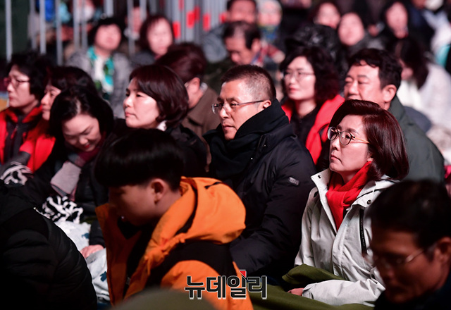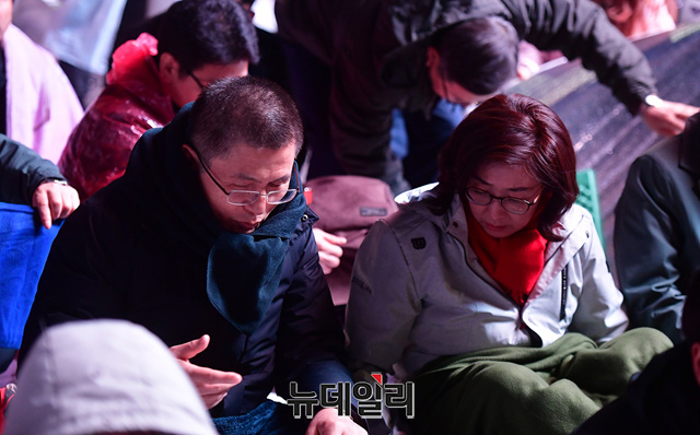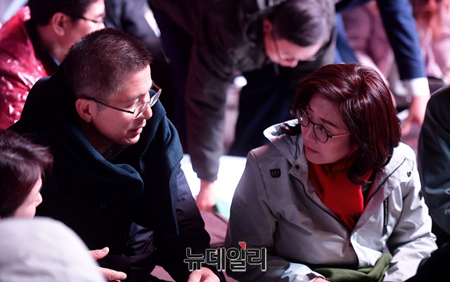 나경원 자유한국당 원내대표가 25일 오후부터 광화문 광장에서 열린 문재인 퇴진 '제3차 범국민대회'에 밤샘철야기도에 참석해 황교안 대표와 대화를 나누고 있다. 나 대표는 자정이 조금 지난 시간 철야기도회에 참석해 오전 1시 20분까지 황 대표와 함께했다.