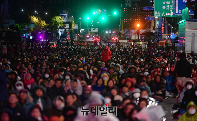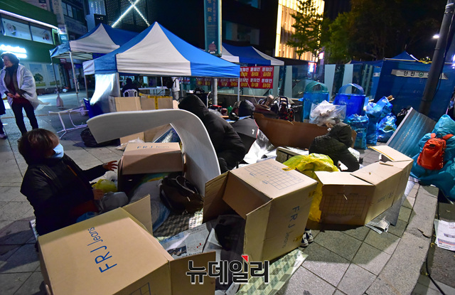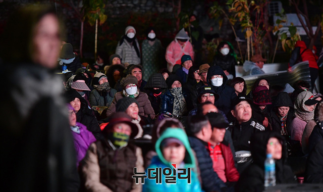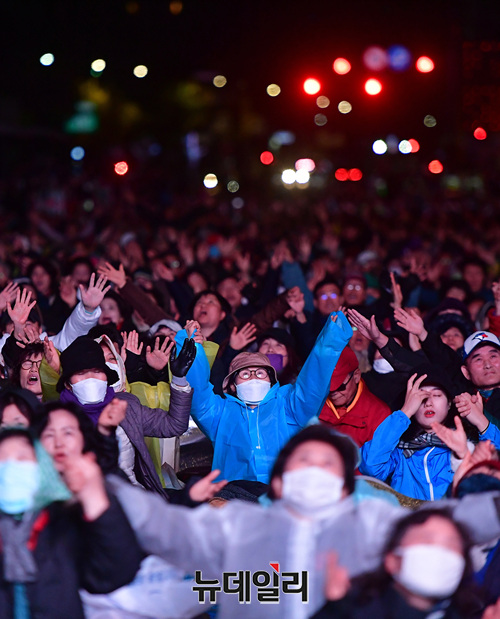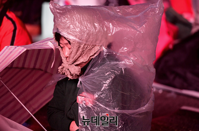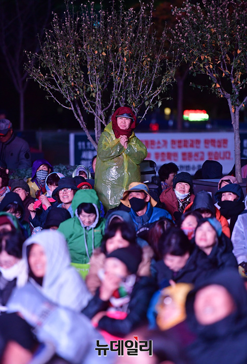 문재인 퇴진 범국민대회 참석한 시민들이 26일 새벽 광화문 광장에서 철야기도를 이어가고 있다.이날 밤부터 비가 흩날리고, 기온이 떨어지면서 시민들은 추위와 싸웠다. 우비와 패딩을 입고, 단열 스티로폼을 바닥에 깔거나 준비한 돗자리와 텐트 등으로 밤샘 기도를 했다. 이날 대회는 1박 2일 일정으로 25일 오후 3시부터 진행됐다.이번 국민대회는 지난 3일 개천절과 9일 한글날에 이은 3번째 범국민대회다. 15시 리허설, 19시 투쟁대회, 22시 철야기도로 이어지고 있다.
