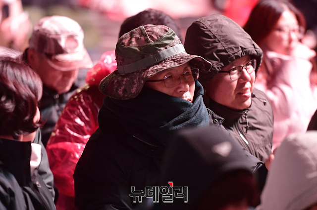 황교안 자유한국당 대표가 26일 새벽 광화문 광장에서 진행중인 문재인 퇴진 '제3차 범국민대회' 밤샘철야기도회에 참석해 자리하고 있다. 새벽에 낮아진 기온으로 모자와 목도리를 하고 있다.전날 오후 8시부터 국민대회에 참석한 황 대표는 김명연, 정태옥, 전희경, 윤종필 의원 등과 함께 철야기도회가 끝날때까지 자리를 지켰다. 나경원 원내대표도 자정쯤 집회에 참석해 1시간 30분 기도회에 참석했다.이번 범국민대회는 문재인 퇴진을 요구하며 개천절과 한글날에 이은 3번째 대회다.
