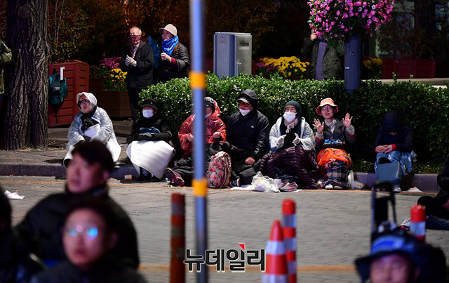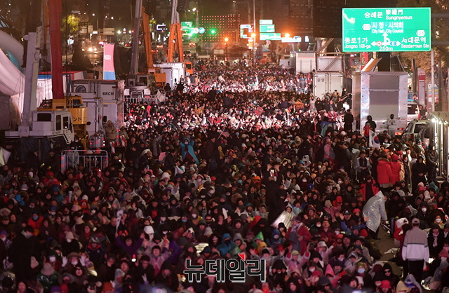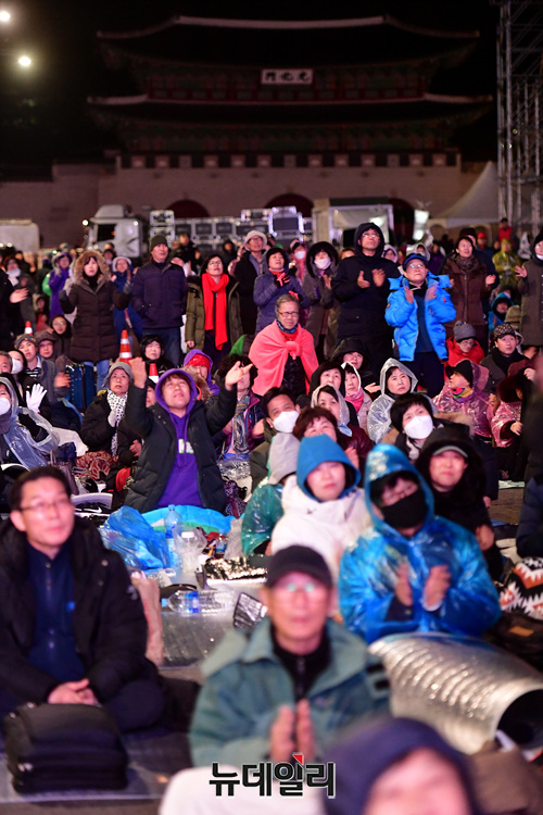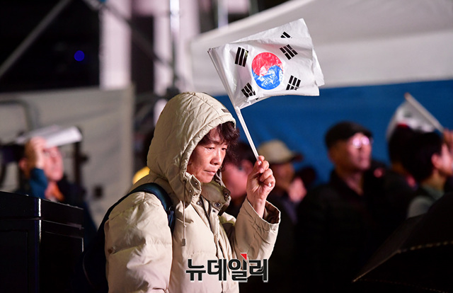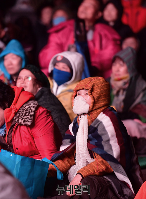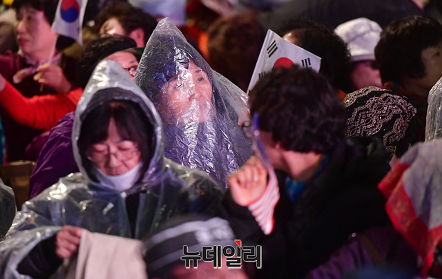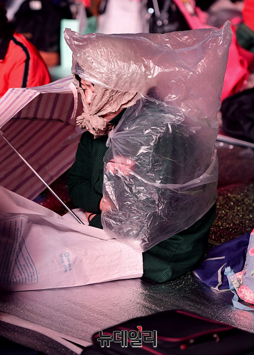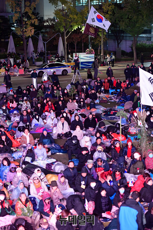 문재인 퇴진 범국민대회 참석한 시민들이 26일 새벽 광화문 광장에서 철야기도를 하고 있다.이날 밤부터 비가 흩날리고, 기온이 떨어지면서 시민들은 추위와 싸웠다. 우비와 패딩을 입고, 단열 스티로폼을 바닥에 깔거나 준비한 돗자리와 텐트 등으로 밤샘 기도를 했다.조나단 목사의 인도로 전국에서 모인 목사 10여 명이 연단에 올라 10여분 간 설교를 하고 찬양과 기도를 반복했다. 이날 대회는 1박 2일 일정으로 25일 오후 3시부터 진행됐다.이번 대회는 문재인 퇴진을 위해 열린 개천절과 한글날에 이은 3번째 범국민대회다.