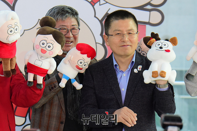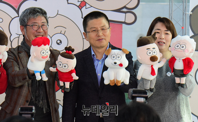 황교안 자유한국당 대표가 28일 오전 국회 의원회관에서 열린 '오른소리가족 제작발표 및 전시회'에서 참석해 인형극 공연을 마친후 인사를 하고 있다.