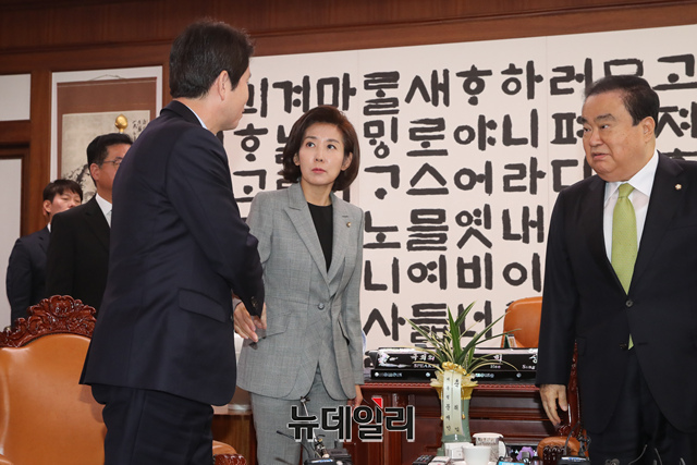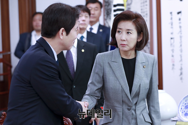 이인영 더불어민주당 원내대표와 나경원 자유한국당 원내대표가 28일 오전 서울 여의도 국회의장실에서 여야 3당 교섭단체 원내대표 회동을 앞두고 악수를 하고 있다.