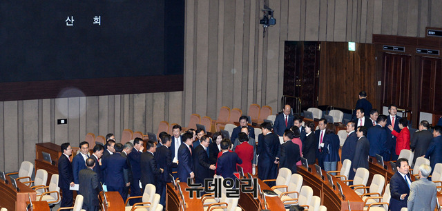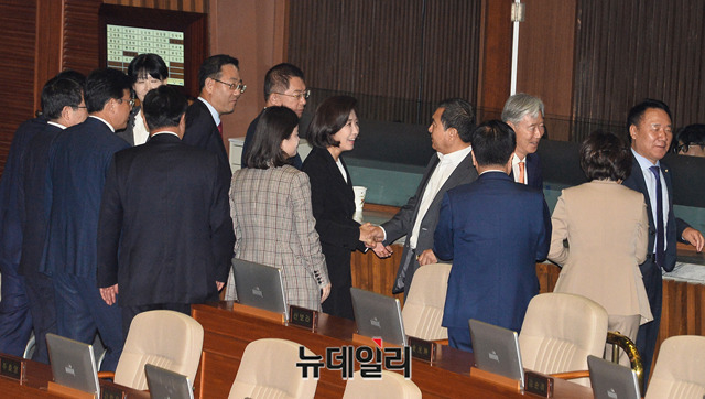 나경원 자유한국당 원내대표가 29일 오전 국회 본회의장에서 교섭단체 대표연설을 마친 후 한국당 의원들과 인사를 나누고 있다.