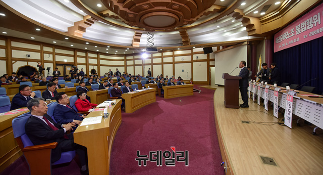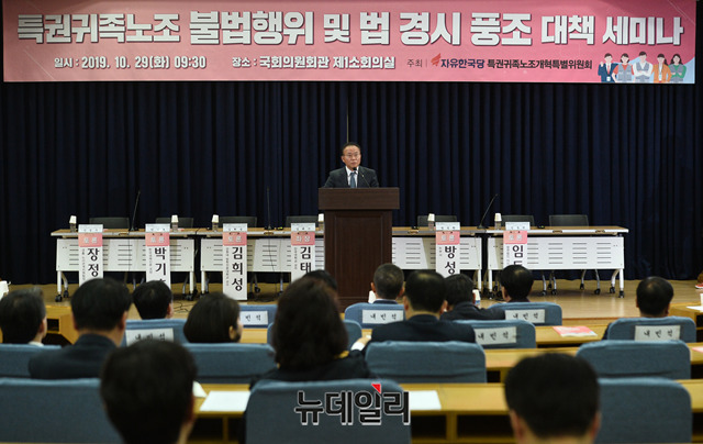 윤재옥 자유한국당 특권귀족노조개혁특위 위원장이 29일 오전 국회 의원회관에서 열린 '특권귀족노조 불법행위 및 법 경시 풍조 대책 세미나'에서 개회사를 하고 있다.한국당 특권귀족노조개혁특별위원회가 주최한 이날 토론회는 김강식 한국항공대학교 교수가 발제를 맡았다. 좌장은 김태기 단국대학교 교수가 맡았다.이어진 토론에는 김희성 강원대 법학전문대학원 교수, 박기호 한국경제신문 국장, 방성환 노무사, 임동채 법무법인 아이앤에스 변호사, 장정우 경총 노사관계지원팀장, 황창락 서울교통공사 본부장이 나섰다.