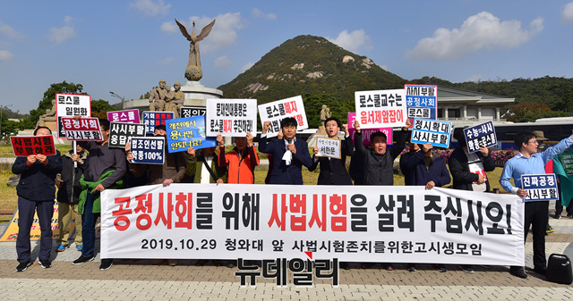 이들은 성명을 통해 "정시확대만으로 공정한 사회는 오지 않는다"며 "공정사회를 위해 사법시험 부활에 문재인 대통령이 앞장 설 것을 촉구한다"고 했다.