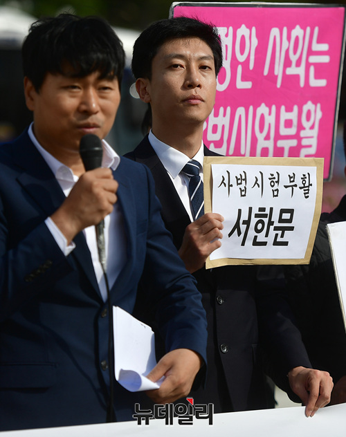 이종배 사법시험존치를 위한 고시생모임 대표를 비롯한 회원들이 29일 오전 서울 청와대 분수대 앞에서 사법시험 부활을 촉구하는 기자회견을 갖고 있다.