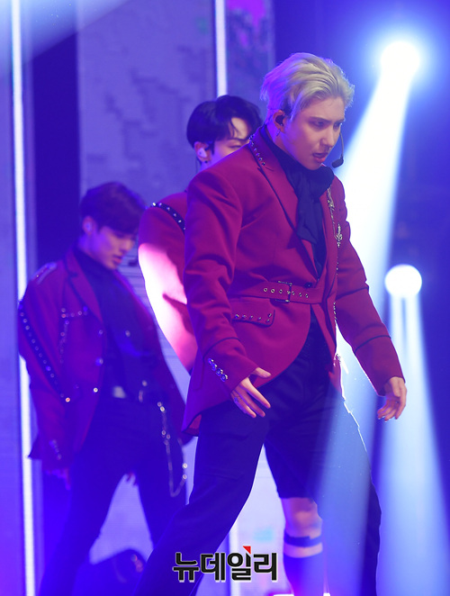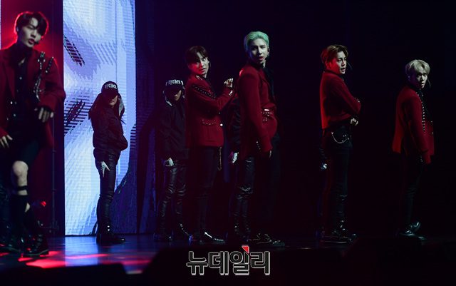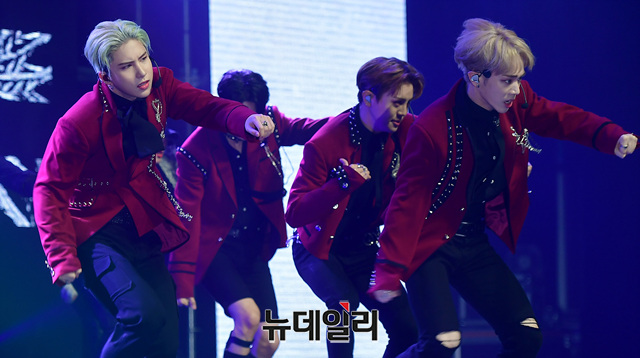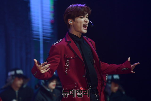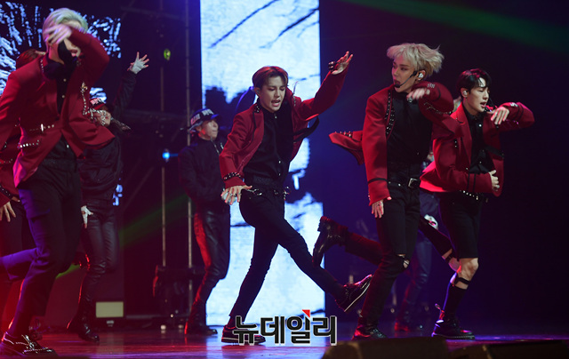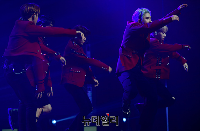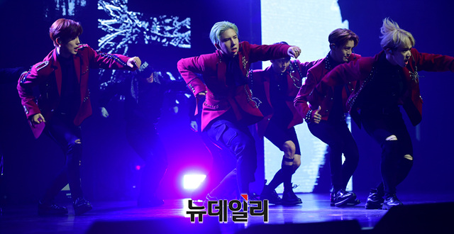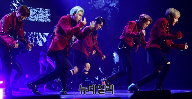 5인조 아이돌그룹 '에이스(A.C.E)'가 29일 오후 서울 광진구 예스24라이브홀에서 열린 3번째 미니앨범 '언더 커버 : 더 매드 스쿼드' 쇼케이스에서 타이틀곡 무대를 선보이고 있다.