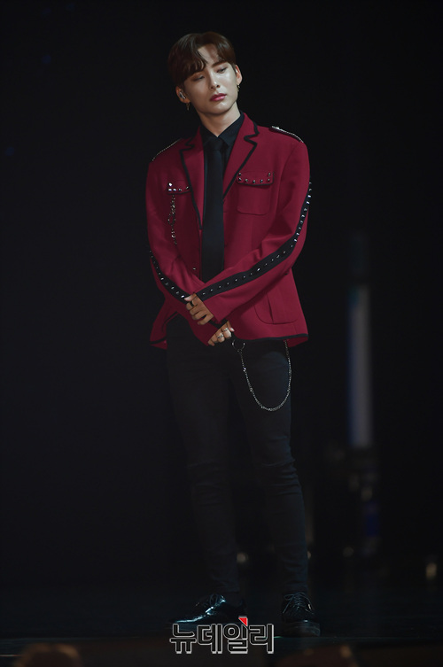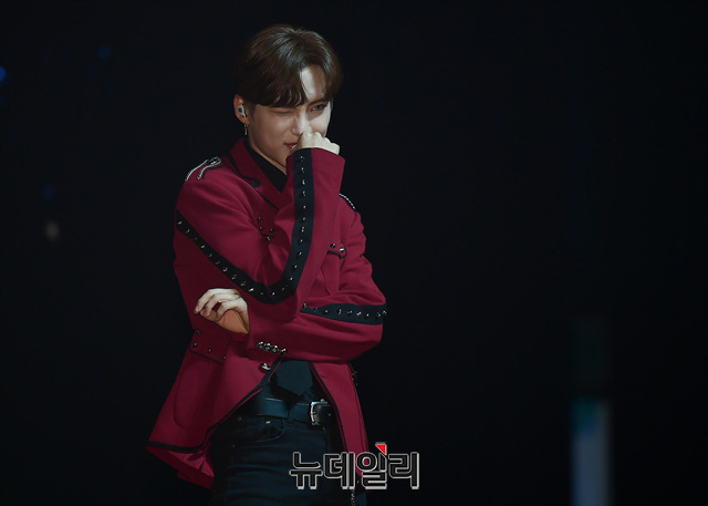5인조 아이돌그룹 에이스(A.C.E) 리더 준이 29일 오후 서울 광진구 예스24라이브홀에서 열린 3번째 미니앨범 '언더 커버 : 더 매드 스쿼드' 쇼케이스에서 포토타임을 갖고 있다.