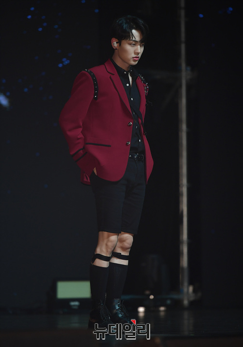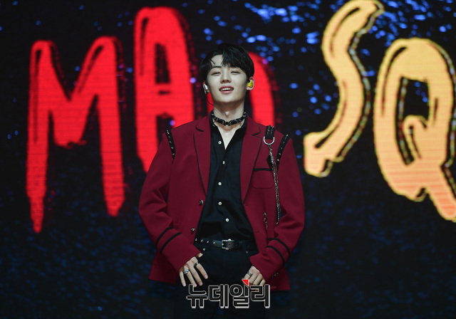 5인조 아이돌그룹 에이스(A.C.E) 막내 찬이 29일 오후 서울 광진구 예스24라이브홀에서 열린 3번째 미니앨범 '언더 커버 : 더 매드 스쿼드' 쇼케이스에서 포토타임을 갖고 있다.