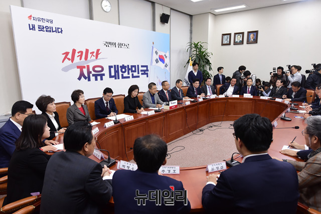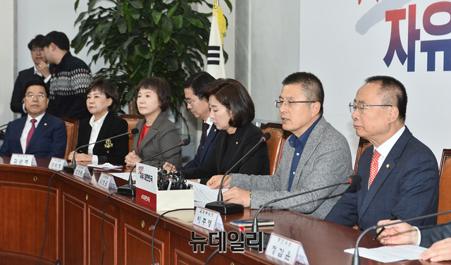 황교안 자유한국당 대표가 30일 오전 국회에서 열린 당대표 및 최고위원·중진의원 연석회의에서 모두발언을 하고 있다.