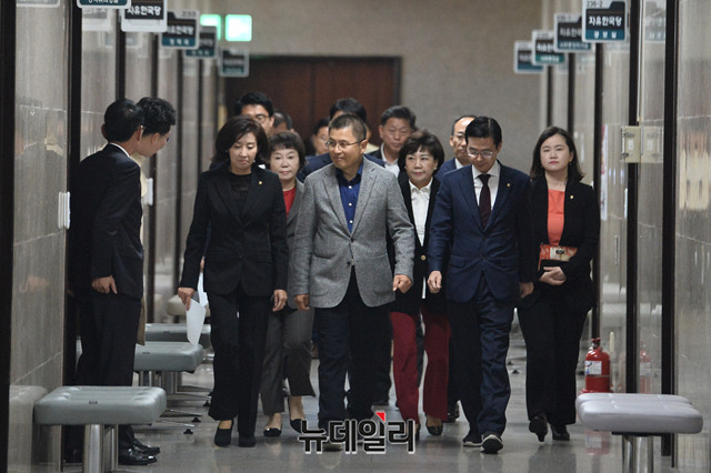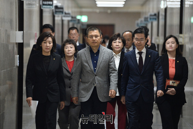 황교안 자유한국당 대표, 나경원 원내대표, 조경태 최고위원, 김순례 최고위원 및 지도부가 30일 오전 국회에서 열린 당대표 및 최고위원·중진의원 연석회의에 입장하고 있다.