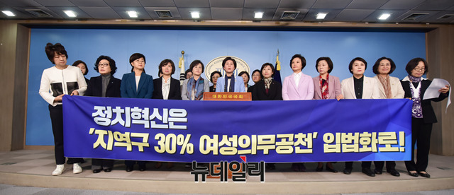 백혜련 더불어민주당 전국여성위원장 및 의원들이 30일 오전 국회 정론관에서 '지역구 30% 이상 여성공천 의무 입법 촉구 기자회견'을 갖고 있다.