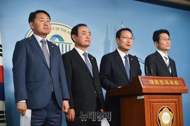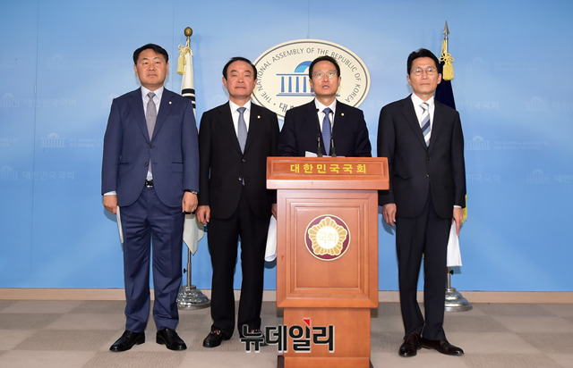 4당 전·현직 원내대표(왼쪽부터 김관영 전 바른미래당 원내대표, 장병완 전 민주평화당 원내대표, 홍영표 전 더불어민주당 원내대표, 윤소하 정의당 원내대표)가 30일 오전 국회 정론관에서 '패스트트랙 관련법 처리' 관련 기자회견을 갖고 있다.