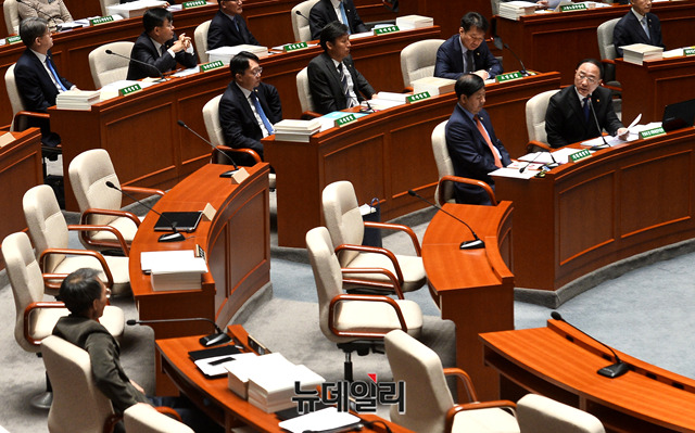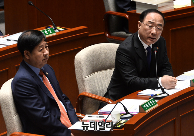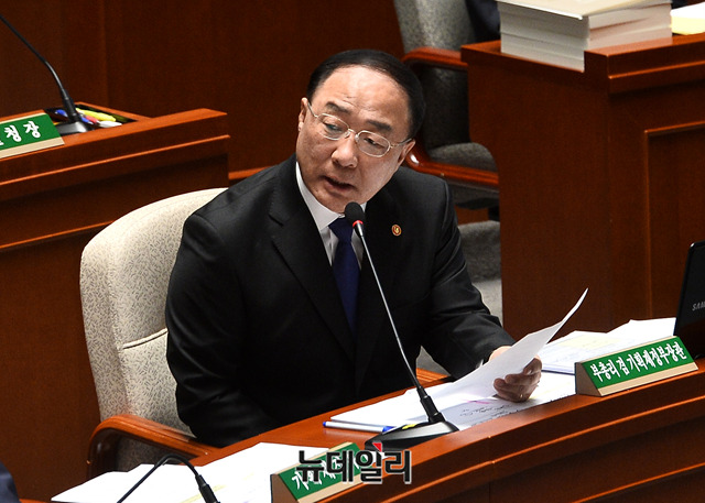 홍남기 경제부총리 겸 기획재정부 장관이 29일 국회에서 열린 예산결산특별위원회에 참석해 의원들의 질의에 답하고 있다.